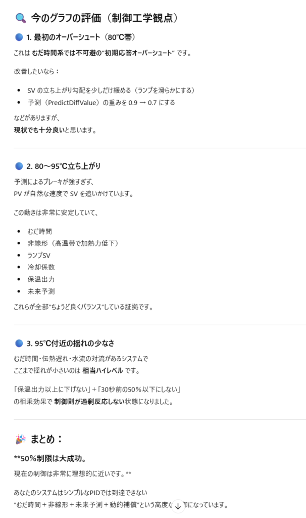 さらに、予測が オーバーシュート気味 のときは +10%、逆に 加熱が追いついていない ときは -10% といったように、リアルタイムで補正を加えることで、算出の精度を高めています。