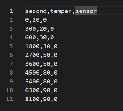 経過秒数と温度とセンサー番号を指定したcsvファイルを読み込ませます