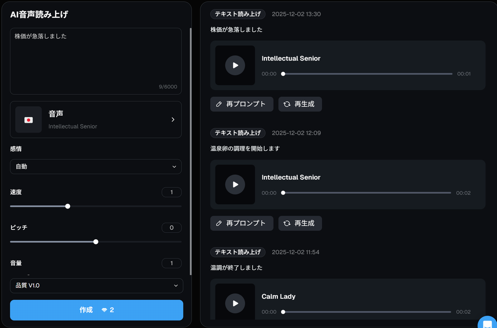 アラート用途だと、もう少し淡々とした声や機械的な読み上げの方が合いますね。