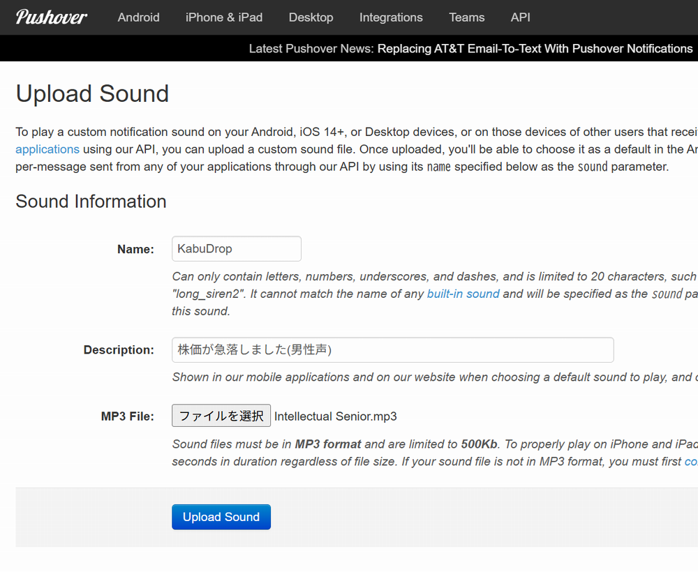 Pushover では、50KB未満の MP3 ファイルを通知音として鳴らすことができます。