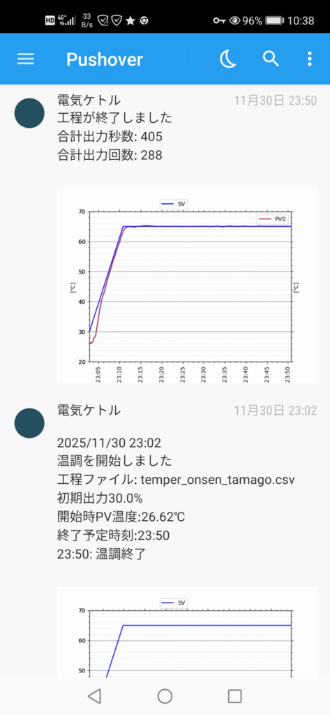 これはラズベリーパイの温度制御プログラムから自分のスマホに通知を送ったところです