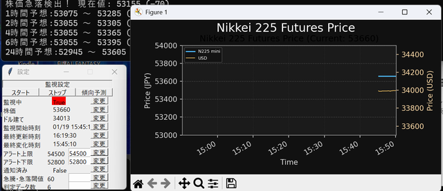 日経先物とドル円を二軸にして、データを記録するようにしました。
